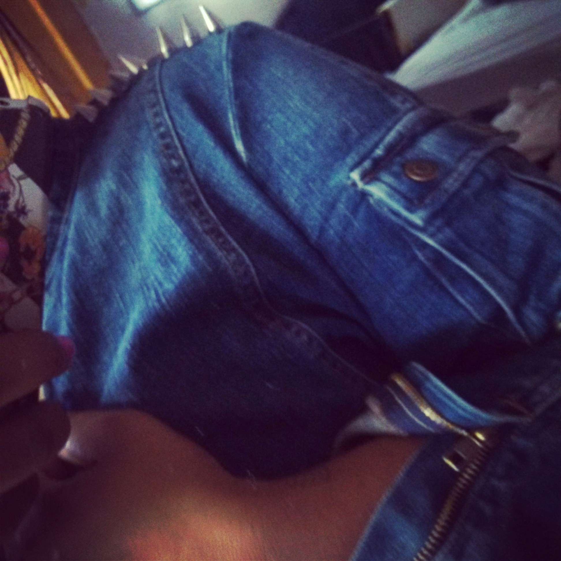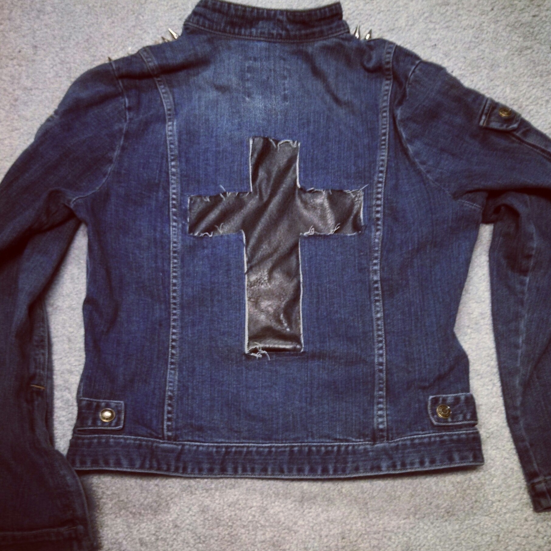 Spiked Crossback Stretch Denim Moto Jacket - Size Medium